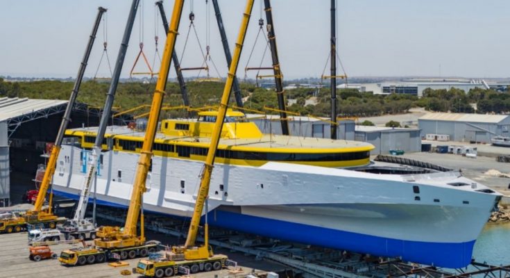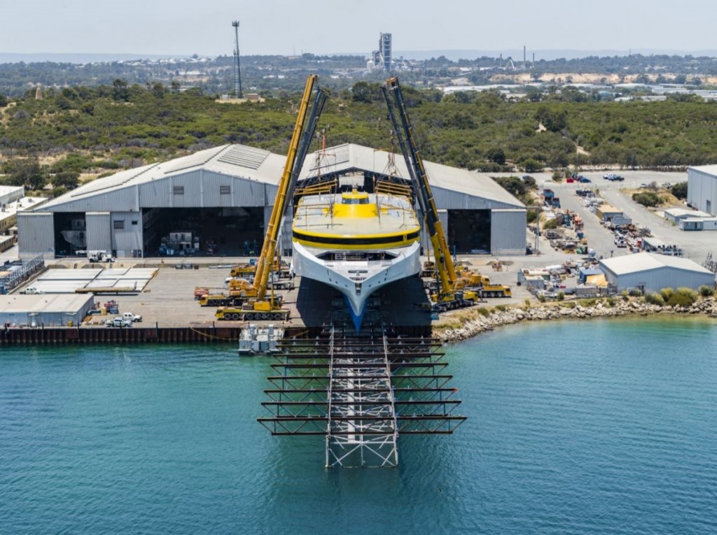 Lørdag d. 14. december, blev trimaranen BAJAMAR EXPRESS rullet ud af byggehallen på Austals værft i Henderson Australien. Derefter blev passagerområdet løftet op på skroget.