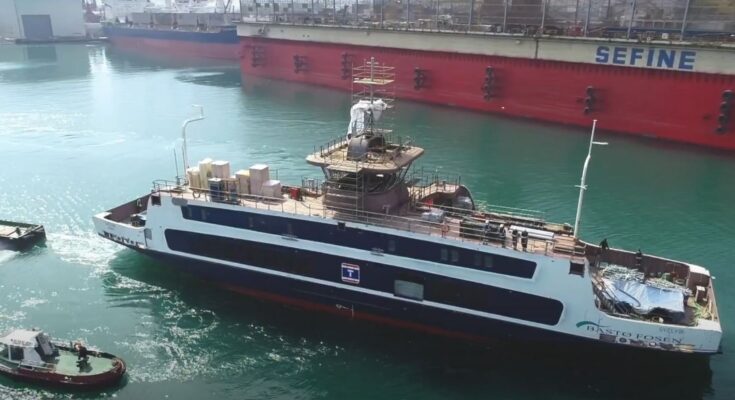 Bastø Fosen’s nye hybridfærge SVELVIK blev søsat i sidste uge på det tyrkiske værft Sefine Shipyard.