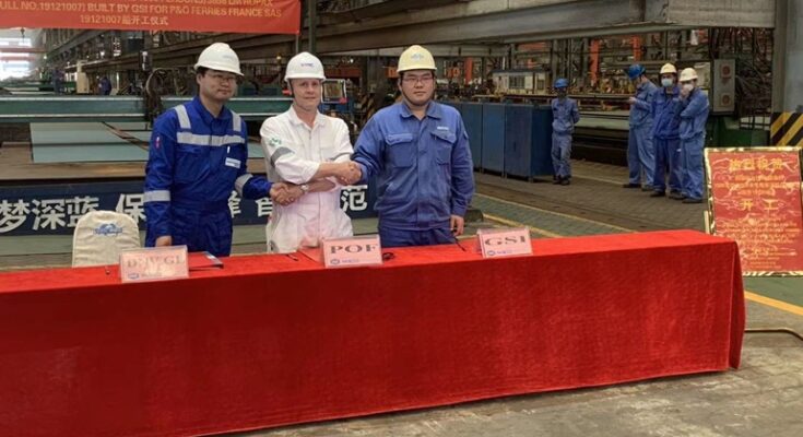 Torsdag d. 15. oktober blev den første stålplade, til den første af to dobbeltender færger, som P&O Ferries har bestilt hos Guangzhou Shipyard International (GSI) skåret.