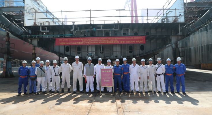 Der var i forrige uge, køllægning af færgen GNV AURORA på det kinesiske værft Guangzhou Shipyard International. GNV AURORA er den sidste ud af fire færger, som det italienske rederi Grandi Navi Veloci (GNV) har bestilt på værftet.