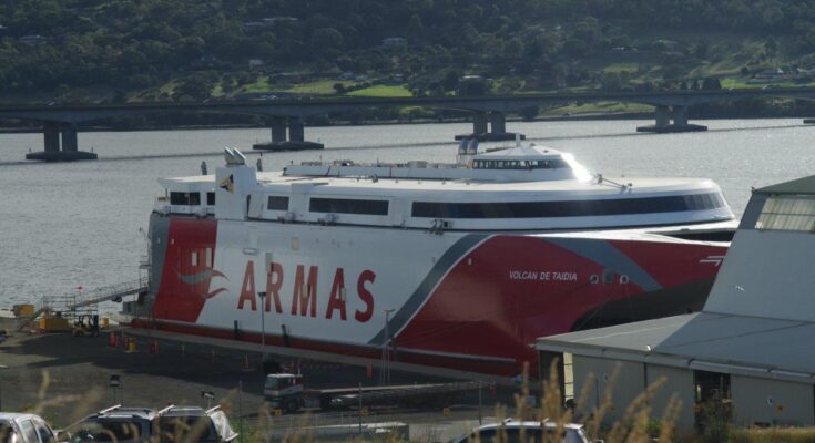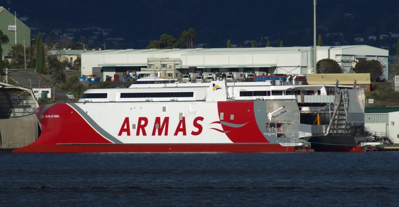 Naviera Armas nye hurtigfærge VOLCÁN DE TAIDÍA, blev tirsdag d. 22. juni søsat ved Incat værftet på Tasmanien. VOLCÁN DE TAGORO forventes på prøvesejlads den 11. juli, og med levering til Naviera Armas senere i juli.